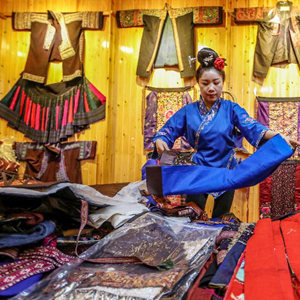 4月23日,在台江县姊妹街,苗家妇女在整理苗服。