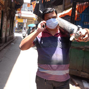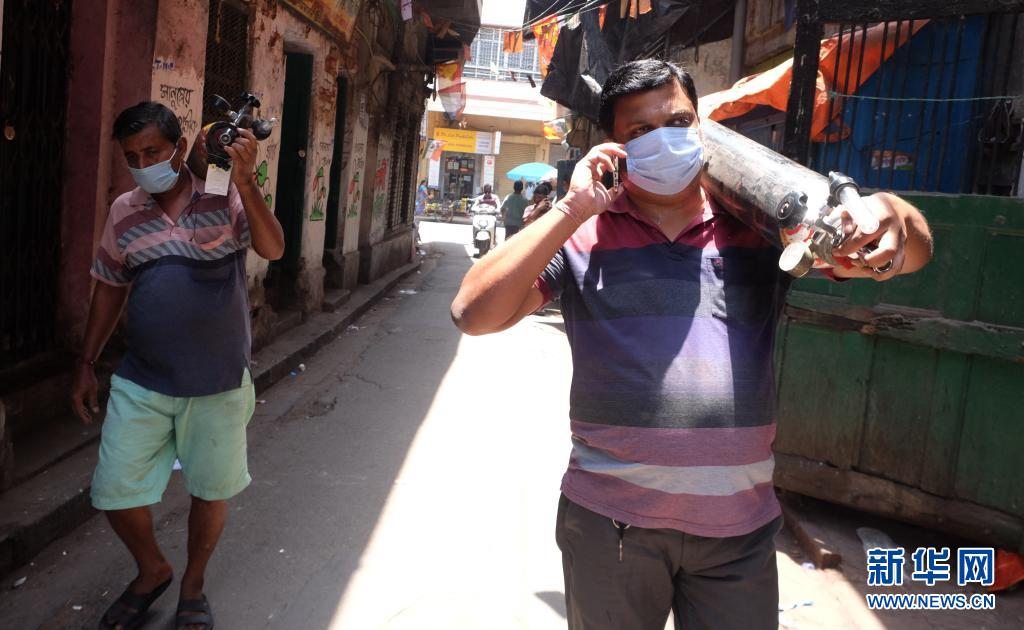 4月23日,医护人员在印度加尔各答背着氧气瓶行走。