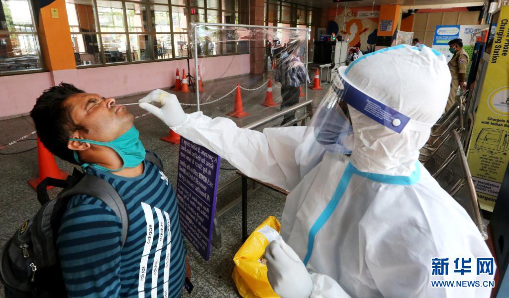 4月23日,医务人员在印度博帕尔的火车站进行新冠病毒检测采样。