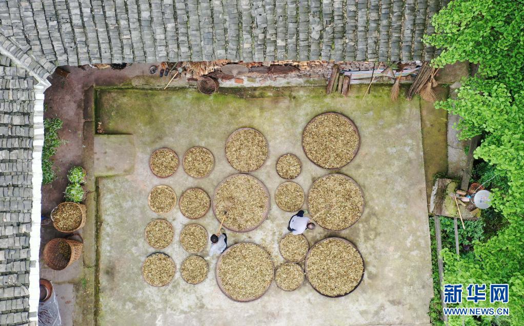 4月23日,在赤水市旺隆镇富顺村,村民晾晒制作虫茶的白茶叶(无人机照片)。