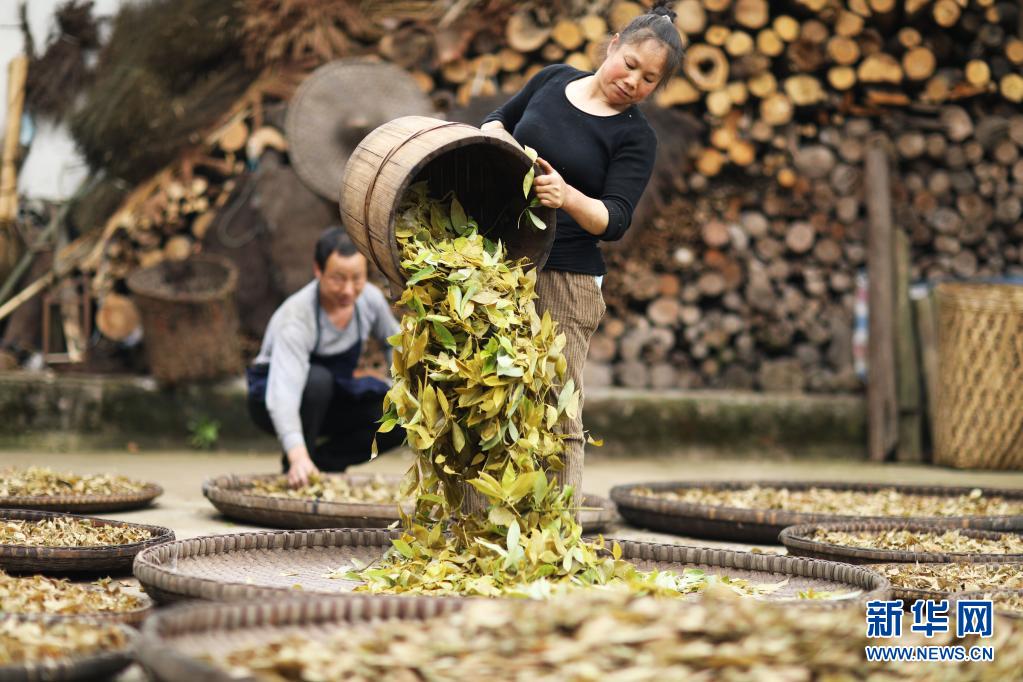 4月23日,在赤水市旺隆镇富顺村,村民晾晒刚蒸煮过的白茶叶。