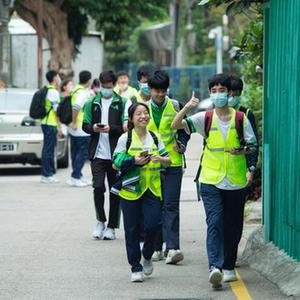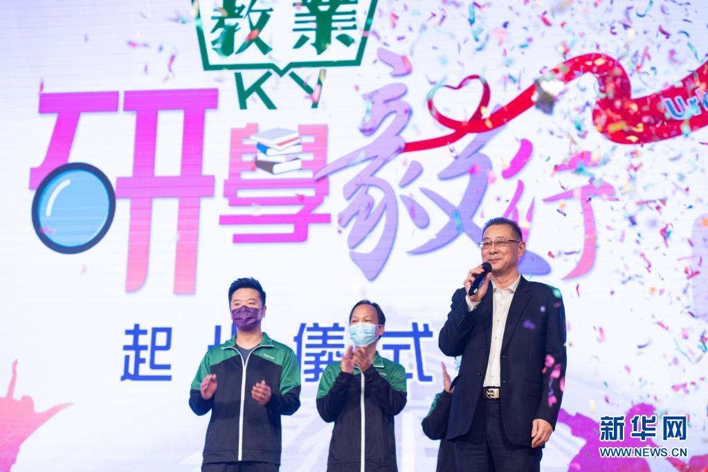 3月27日,澳门教业中学校长贺诚(右一)在“研学毅行”起步礼上。新华社记者 张金加 摄