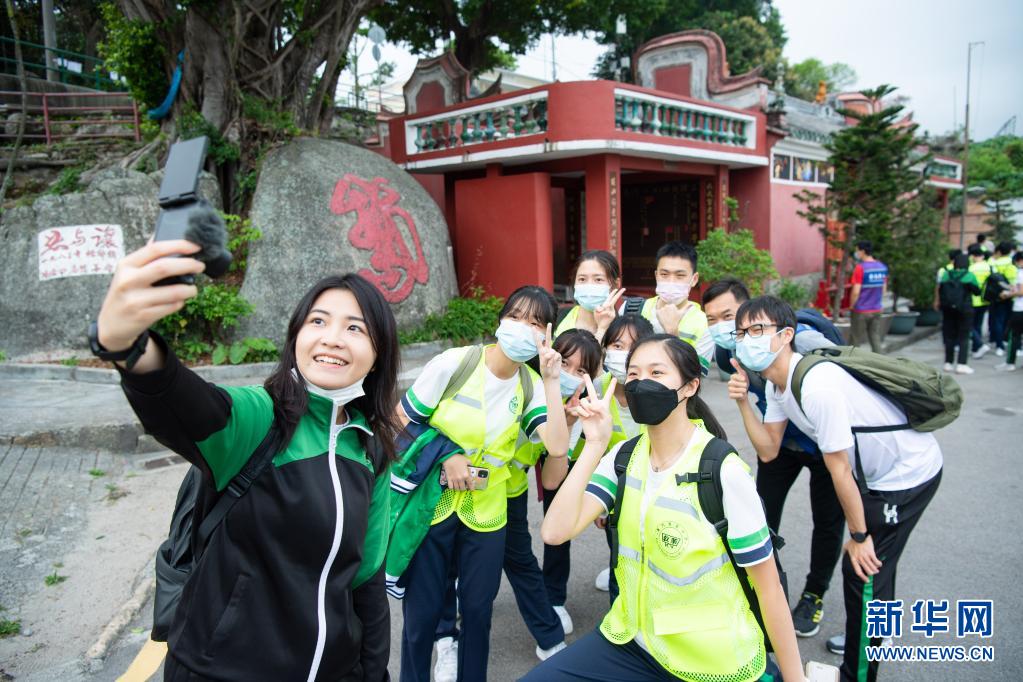 3月27日,澳门教业中学学生在路环谭公庙前自拍。新华社记者 张金加 摄