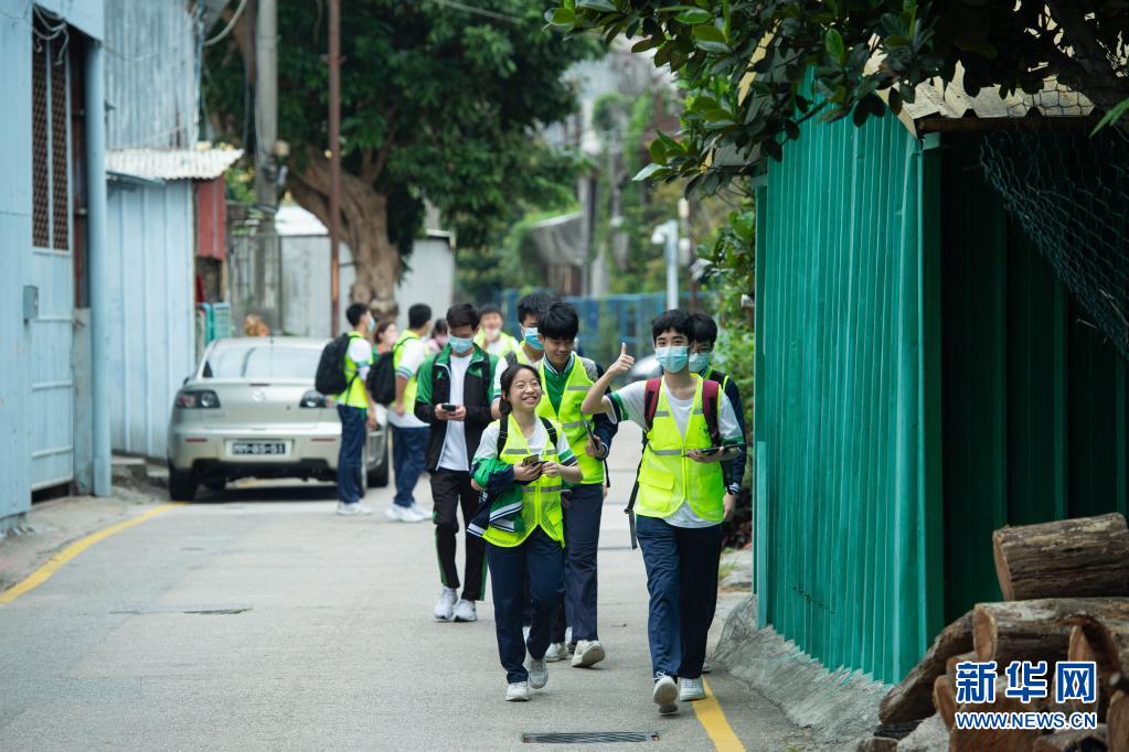3月27日,澳门教业中学学生在路环荔枝碗村路上。新华社记者 张金加 摄