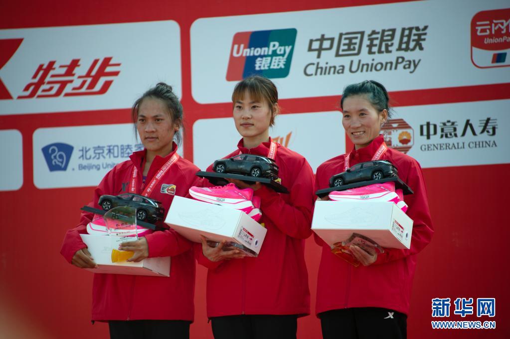 4月24日,第一名金铭铭(中)、第二名何巫呷(左)和第三名史立莹在女子组颁奖仪式上。