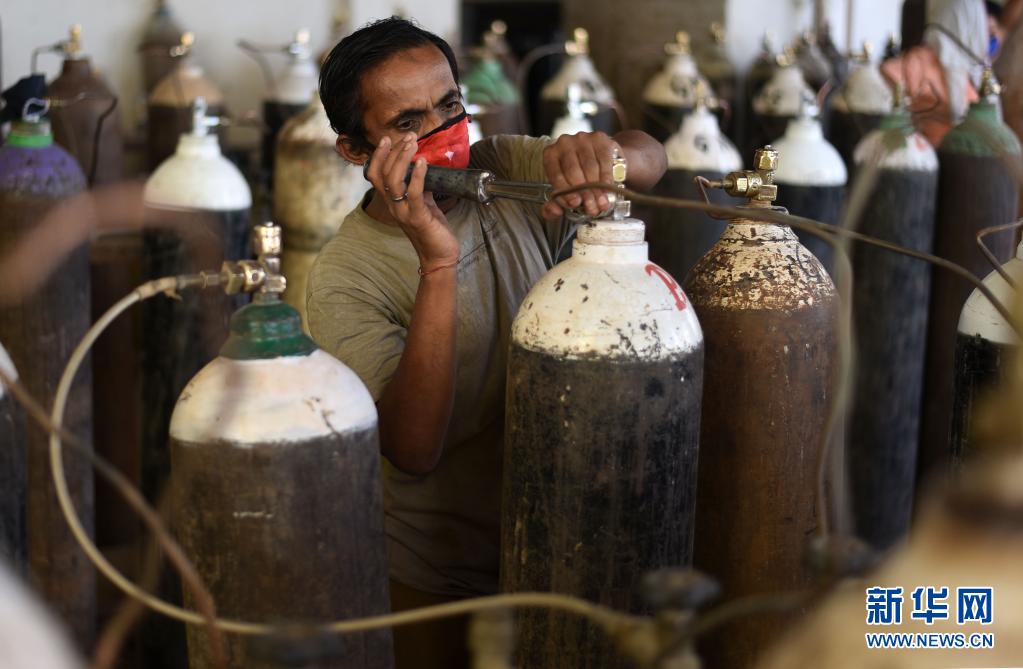 4月19日,工作人员在印度普拉亚格拉杰为医用氧气罐充氧。