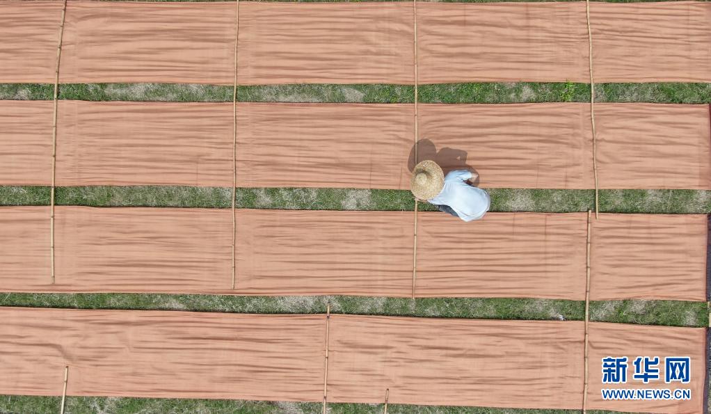 在广东省佛山市西樵香云纱传承基地,工人在晒莨,即将浸过薯莨水之后的绸匹置于草地上暴晒至干(4月23日摄,无人机照片)。