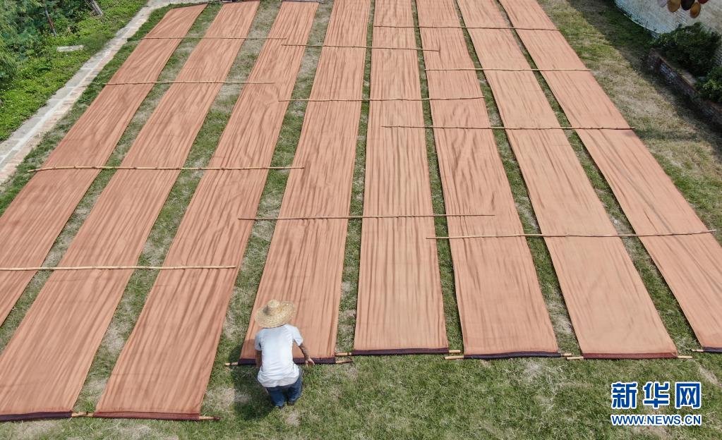 在广东省佛山市西樵香云纱传承基地,工人在晒莨,即将浸过薯莨水之后的绸匹置于草地上暴晒至干(4月23日摄,无人机照片)。