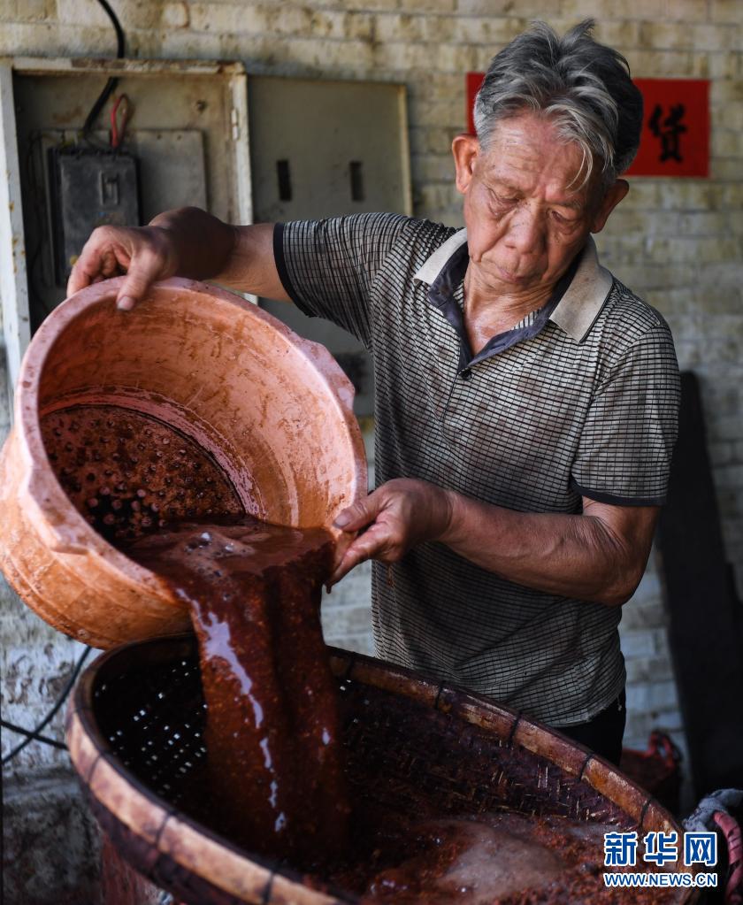在广东省佛山市西樵香云纱传承基地,工人过滤染色用的薯莨汁液(4月23日摄)。