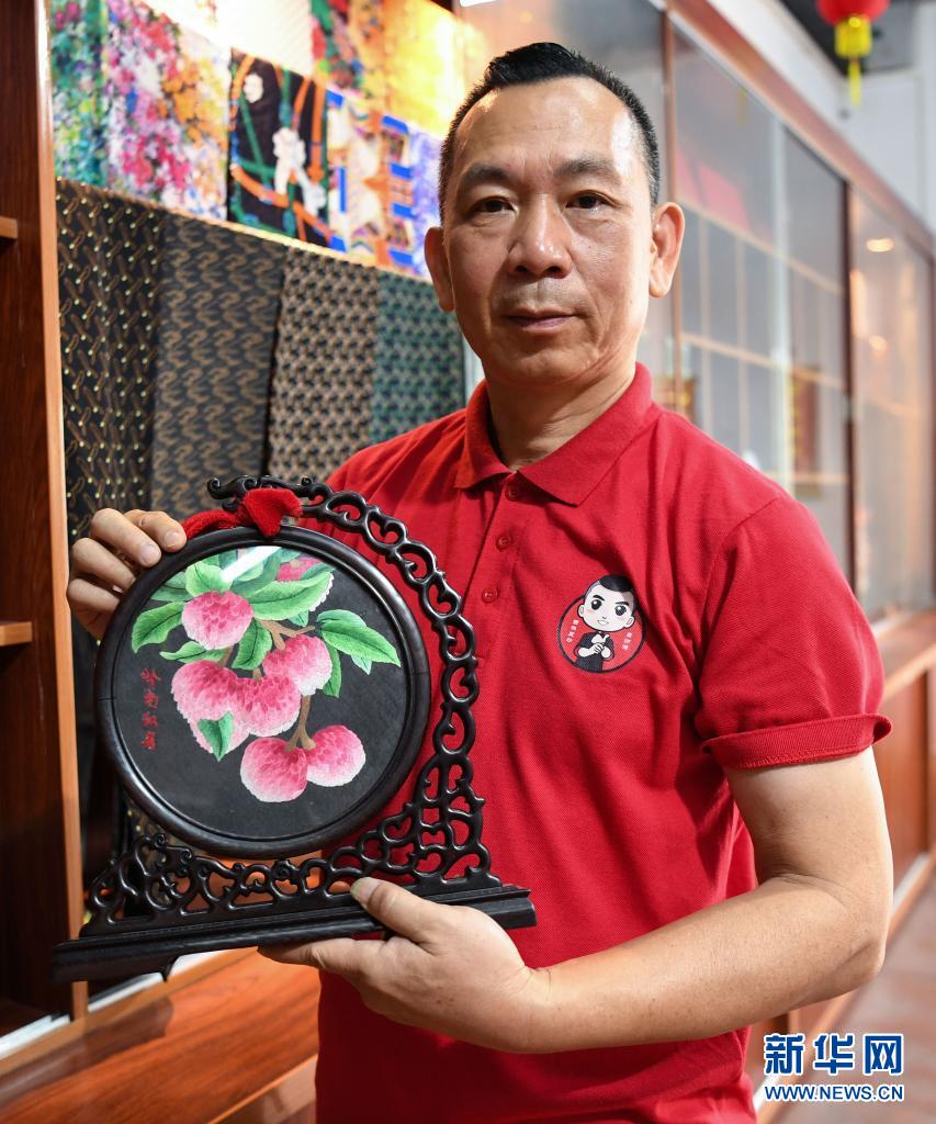 在广东省佛山市西樵香云纱丝绸博物馆,香云纱织造技艺佛山市级代表性传承人张绍景展示香云纱制作的工艺品(4月23日摄)。