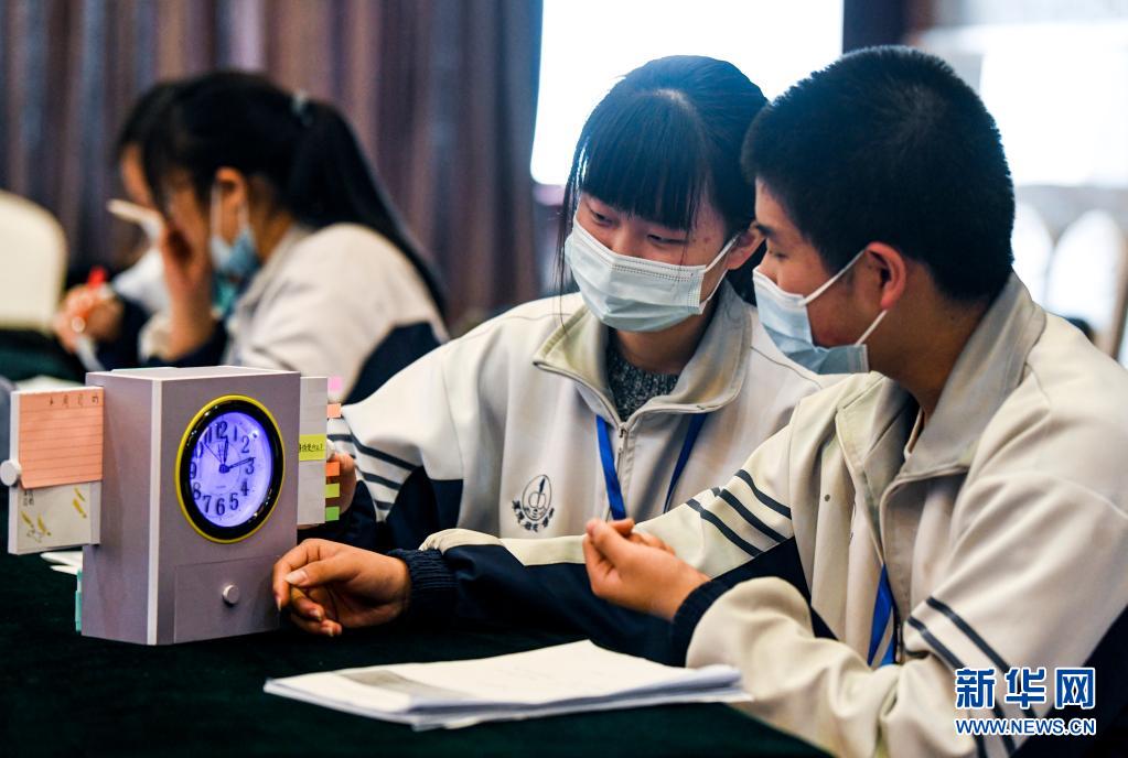 4月24日,在位于新疆科技馆的复赛现场,来自乌鲁木齐市第一中学的高子涵(左)和付鸣一在调试“智能控制”命题组参赛作品。