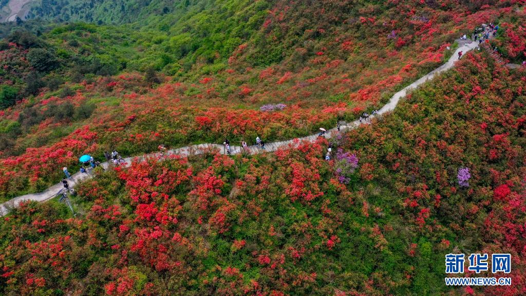 近日,贵州省黔东南苗族侗族自治州丹寨县龙泉山景区的杜鹃花迎来盛花期,美不胜收。为方便游客赏花,4月23日至5月4日,龙泉山脚下的丹寨万达小镇举行一年一度的中国丹寨杜鹃花节,期间将举办光绘摄影、杜鹃花海汉服巡游等30余项活动。