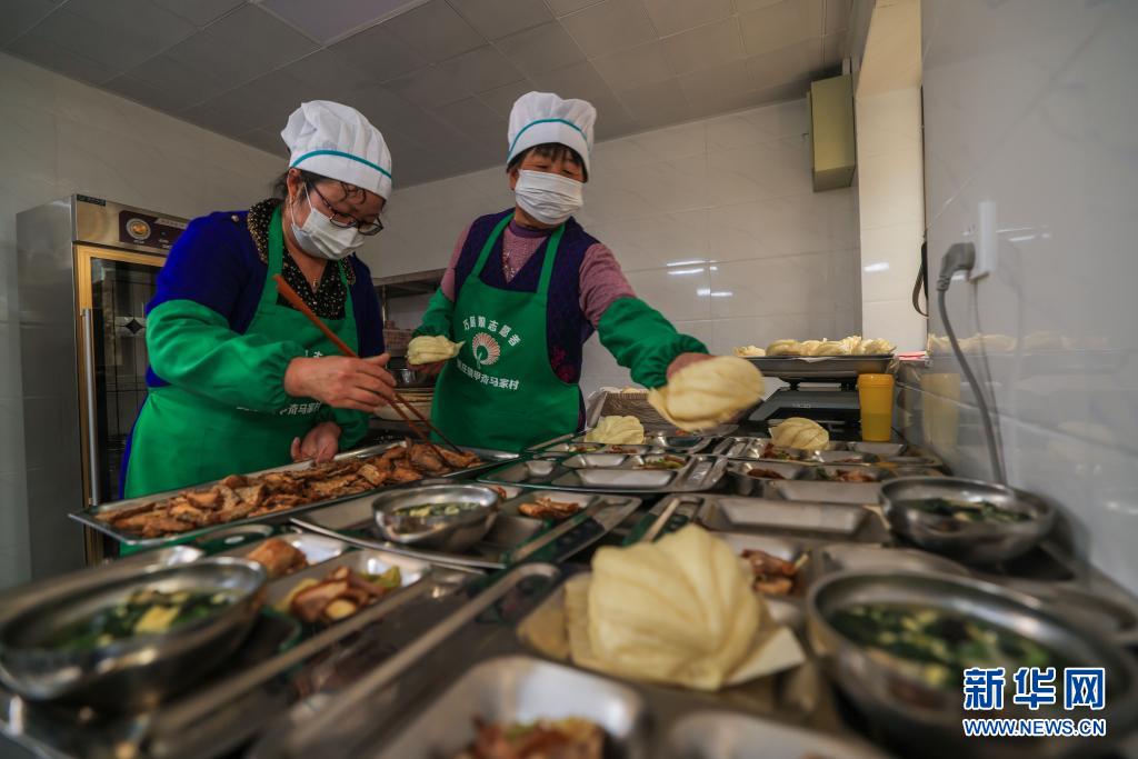 在山东荣成夏庄镇甲夼马家村“暖心食堂”,志愿者为老人准备午餐(4月16日摄)。