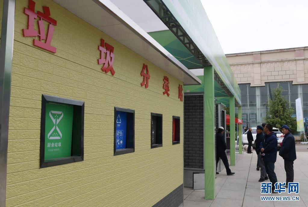 4月24日,在甘肃临夏乡村振兴设施设备展示推广活动上,参观者在了解垃圾分类处理设备。