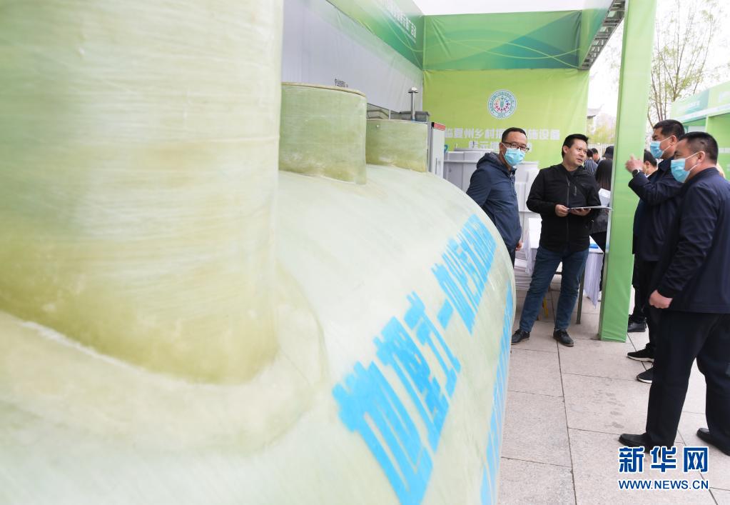 4月24日,在甘肃临夏乡村振兴设施设备展示推广活动上,参观者在了解环保设备。