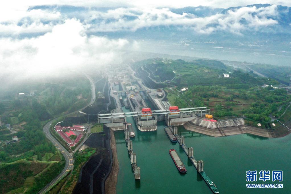 4月20日,船舶有序通过三峡五级船闸(无人机照片)。