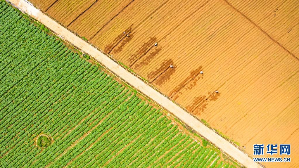 4月20日,贵州省六盘水市六枝特区木岗镇农民在田地里劳作(无人机照片)。