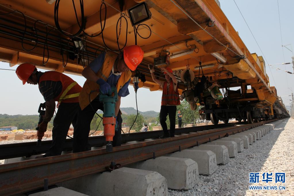 4月24日,工人在景洪市大渡岗乡大荒坝段进行铺轨作业。