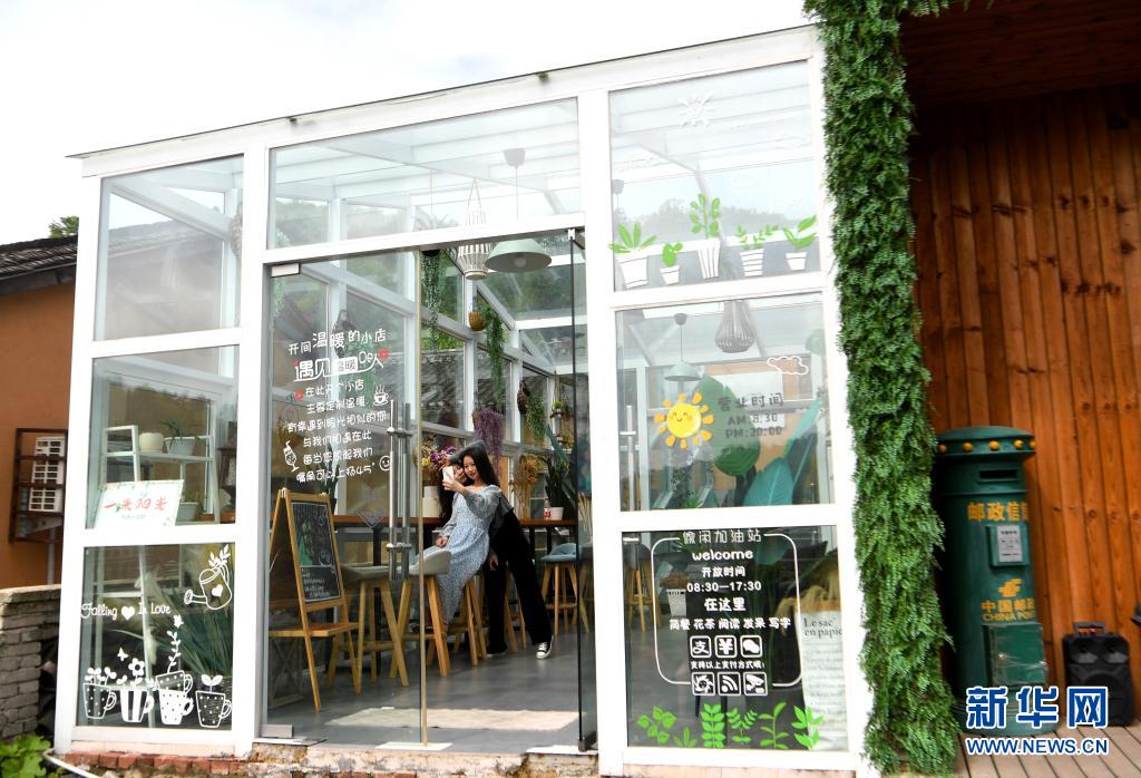 4月22日,游客在田铺大塆一家文创店内拍照留念。