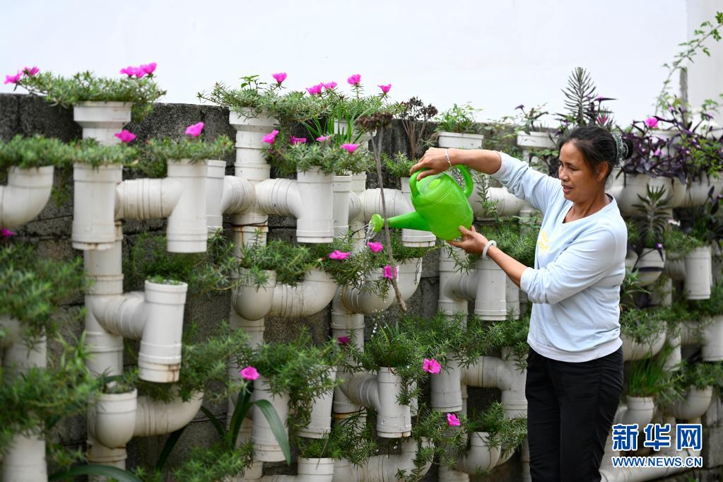 4月24日,在广西柳州市柳江区进德镇白山村山中屯,村民韦苏会在家门口的“微花园”给花浇水。