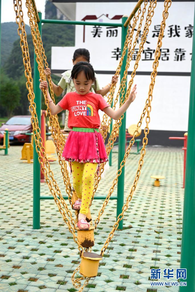 4月24日,在广西柳州市柳江区百朋镇琴屯村,孩子们在健身广场玩耍。