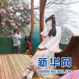 4月24日,游客在峨眉山景区的杜鹃林里留影。