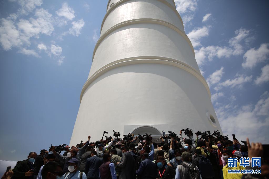 4月24日,记者在尼泊尔加德满都的达拉哈拉塔主体修复工程竣工仪式上拍摄。