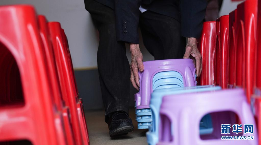 缪延相为孩子们摆放好凳子,为辅导课做准备(4月20日摄)。