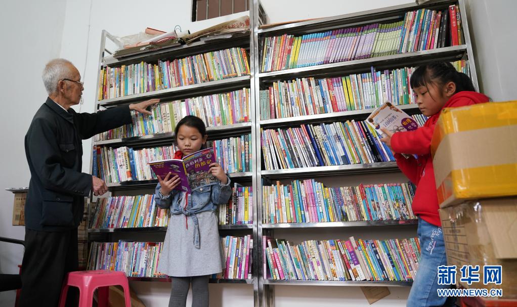 缪延相(左一)在校外辅导站的图书室整理书籍(4月20日摄)。