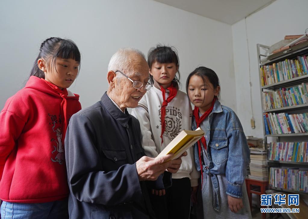 缪延相(左二)在校外辅导站的图书室和孩子们一起看书(4月20日摄)。