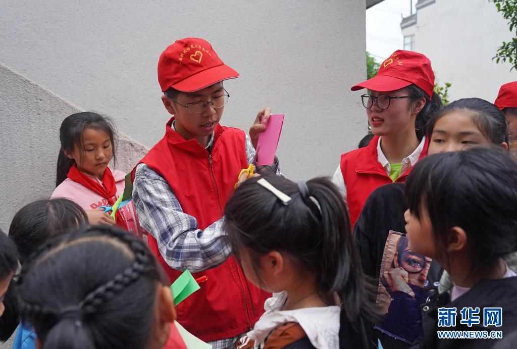 江西科技师范大学的志愿者教孩子们剪纸(4月20日)。