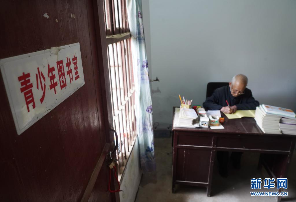 缪延相在图书室给孩子们批改作业(4月20日摄)。