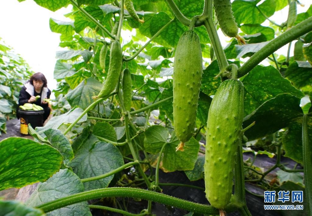4月25日,在滦州市小马庄镇中晒甲坨村,菜农在大棚内采摘黄瓜。