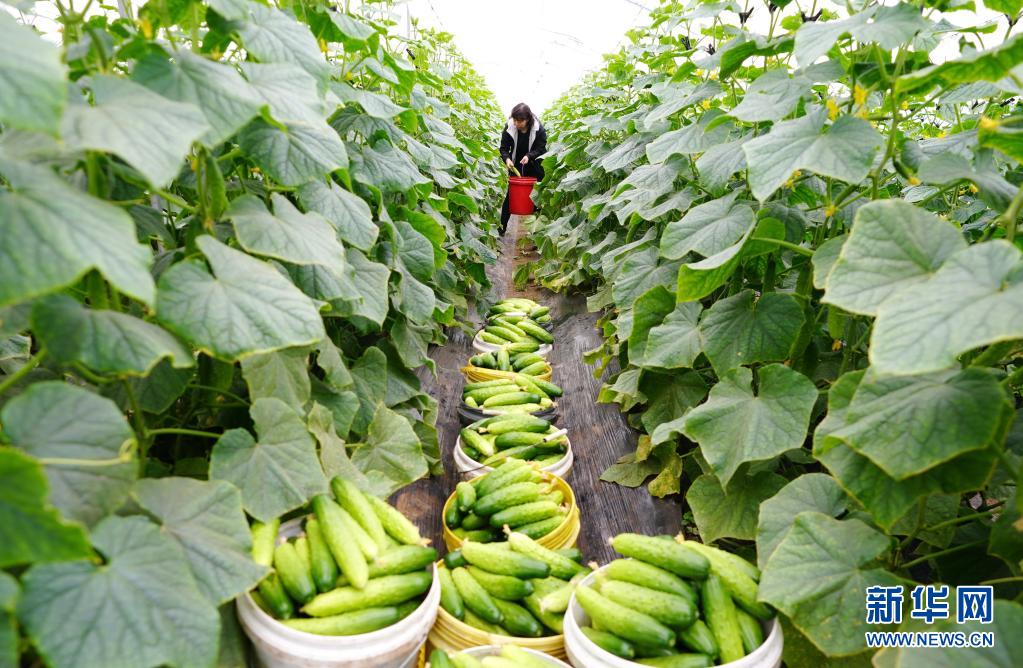 4月25日,在滦州市小马庄镇中晒甲坨村,菜农在大棚内采摘黄瓜。