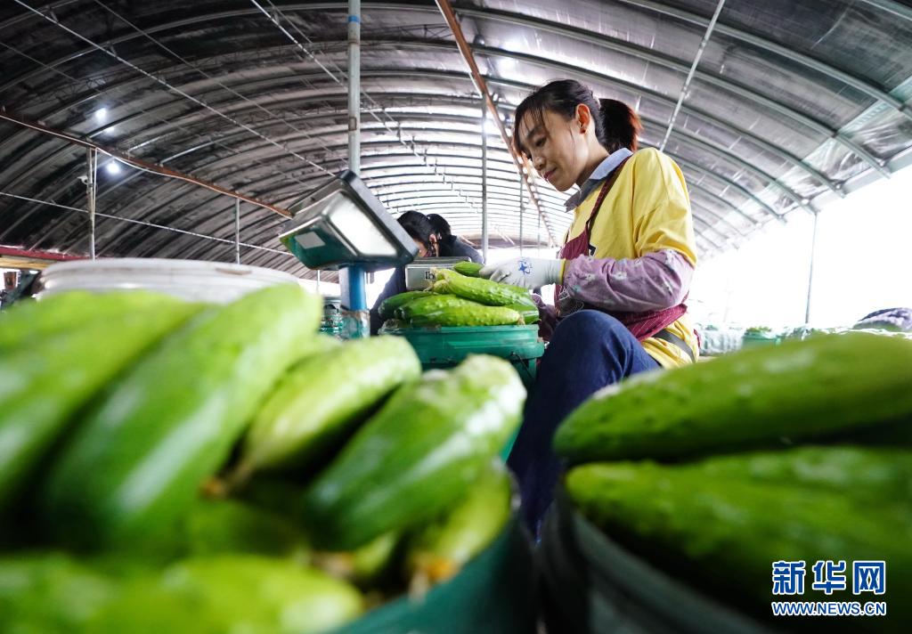 4月25日,在滦州市小马庄镇中晒甲坨村,菜农将收获的黄瓜称重。