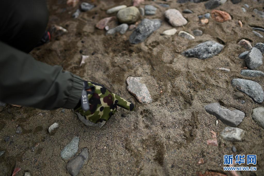 4月22日,祁连山国家公园油葫芦管护站站长德康在巡护途中查看动物足迹。
