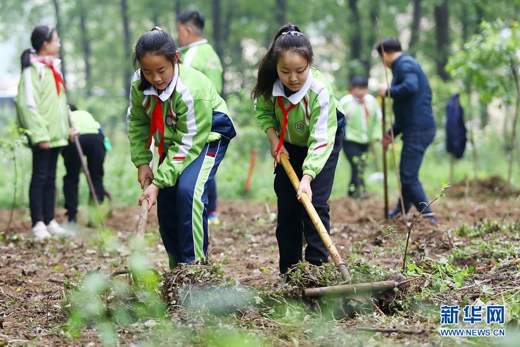 4月25日,淮北市第三实验小学的学生在体验除草。
