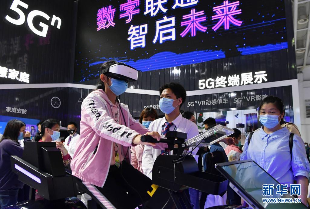 观众在体验5GVR动感单车,骑上它,仿佛置身于真实赛道,可以体验到赛车的失重感(4月25日摄)。