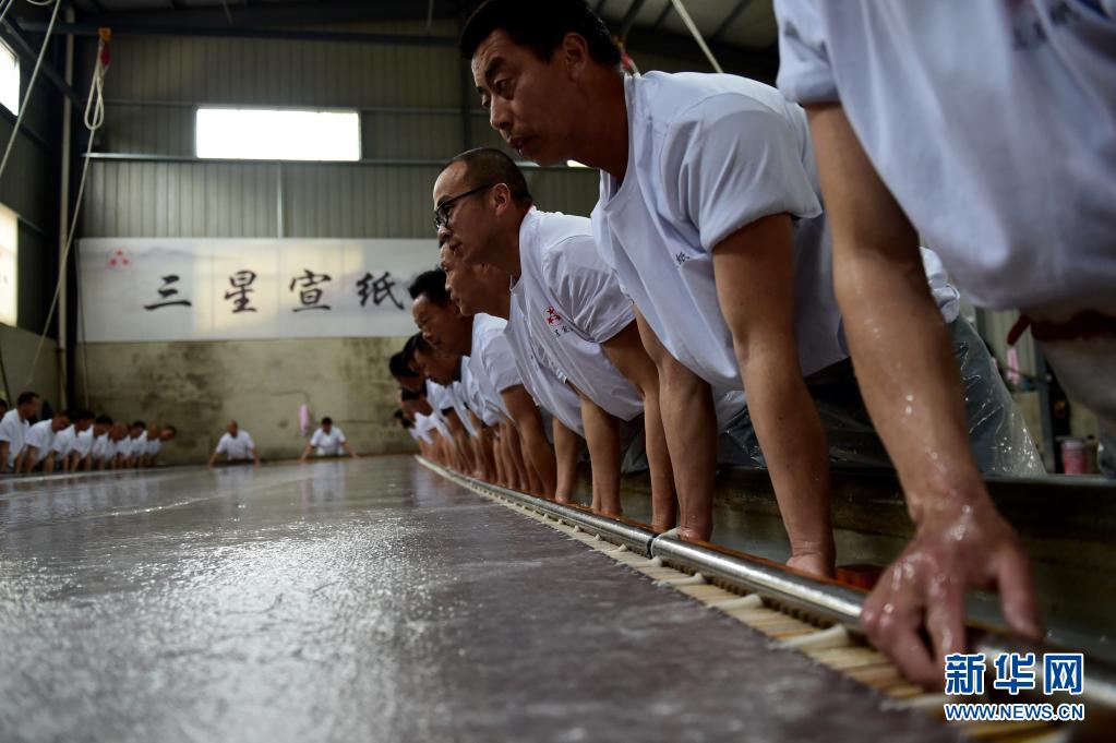 近日,在宣纸产地安徽省宣城市泾县,“四丈宣纸”的抄制在一家纸业有限公司启动。50余名捞纸师傅操作巨型纸帘,齐心协力,在纸槽旁进行捞纸作业。来回起落两次,动作整齐划一。随后工人们将纸帘吊起放至一边揭下,一张巨大的宣纸便捞制成功。经过晒、剪等工序后, 制成长13.2米、宽3.6米的巨型宣纸就是“四丈宣纸”。