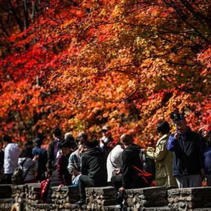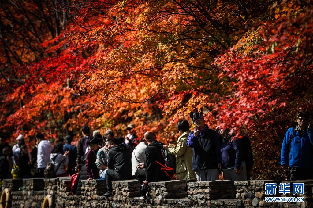 游客在辽宁省本溪满族自治县大石湖风景区观赏枫叶(2020年10月7日摄)。新华社记者 潘昱龙 摄