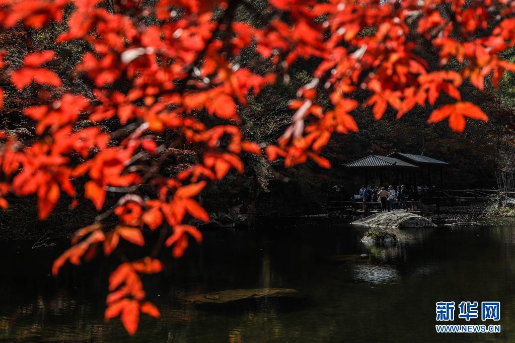游客在辽宁省本溪满族自治县大石湖风景区观赏枫叶(2020年10月7日摄)。新华社记者 潘昱龙 摄