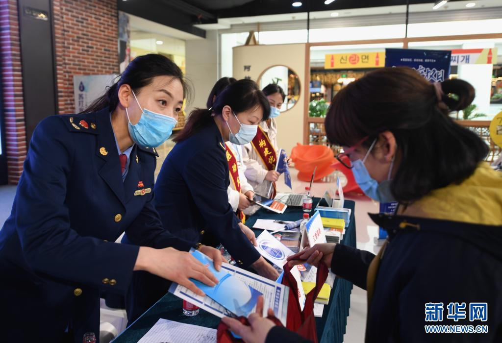 4月26日,工作人员在活动现场向市民发放宣传单。