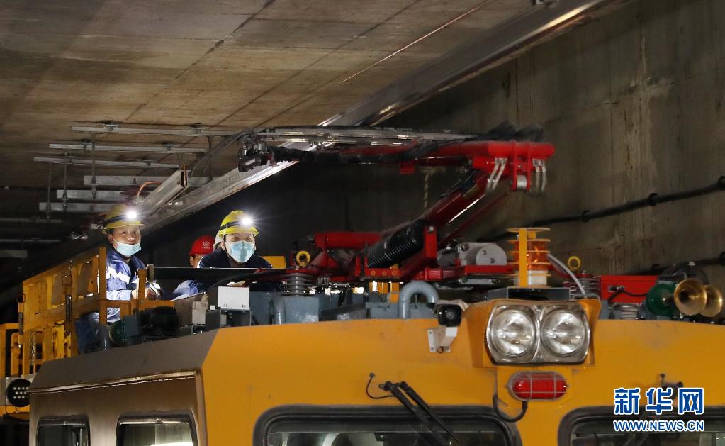 4月26日,技术人员在冷滑作业车顶查看列车接触网运行情况。