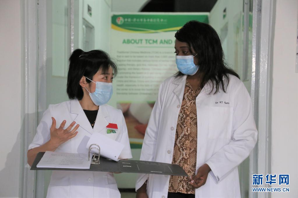 4月20日,在津巴布韦首都哈拉雷的帕里雷尼亚图瓦医院中医针灸中心,孙爽(左)与见习医生卡伦·古鲁雷交流。新华社记者 张玉亮 摄