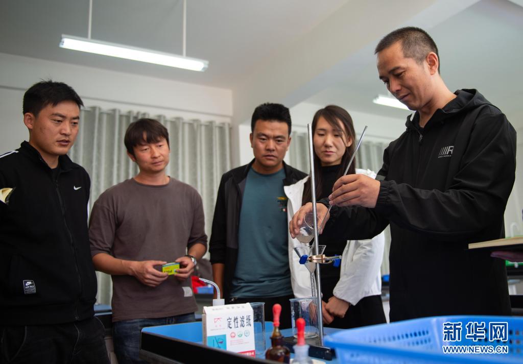 北京市援青支教教师、来自通州区陆辛庄学校的化学教师祁生贵(右一)在青海省玉树州第四民族高级中学指导学校教师进行实验教学(2020年8月12日摄)。