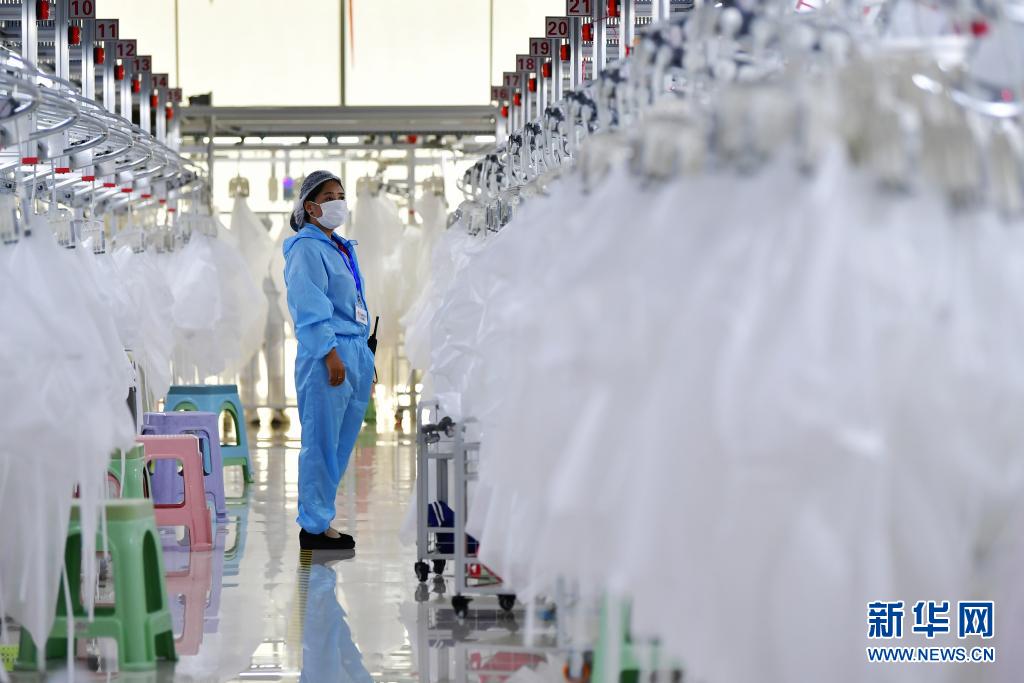 在甘肃临夏回族自治州积石山县,依托东西部扶贫协作平台引进的服装加工企业甘肃拓奇扶贫车间的员工在服装加工生产线上作业(2020年8月9日摄)。