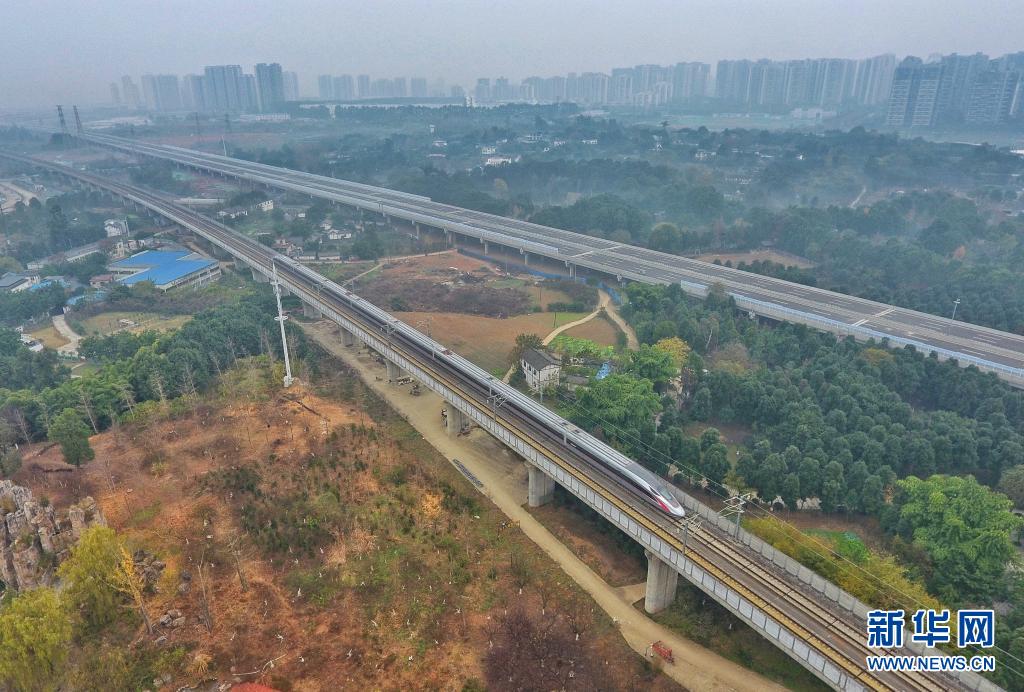 G8607次“复兴号”高铁列车从成都东站出发开往重庆沙坪坝(2020年12月24日摄)。2020年12月24日,“复兴号CR400AF动车组”首次在成渝地区投入运营,自此两地间的高铁通达时间缩短至62分钟,实现成渝间高铁公交化运营1小时通达。成渝高铁是我国“八纵八横”高铁主通道沿江通道的重要组成部分,是成渝地区双城经济圈城际铁路网的主骨架。