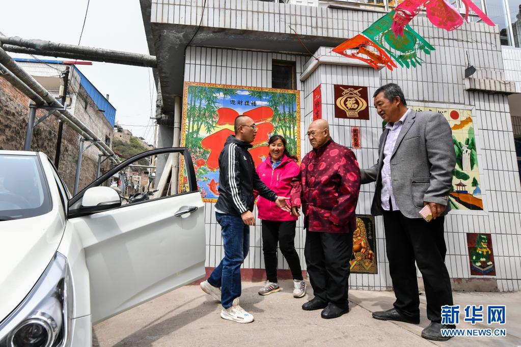 胡在忠(右二)在家门口迎接孙子回家祝寿(4月24日摄)。新华社记者 曹阳 摄
