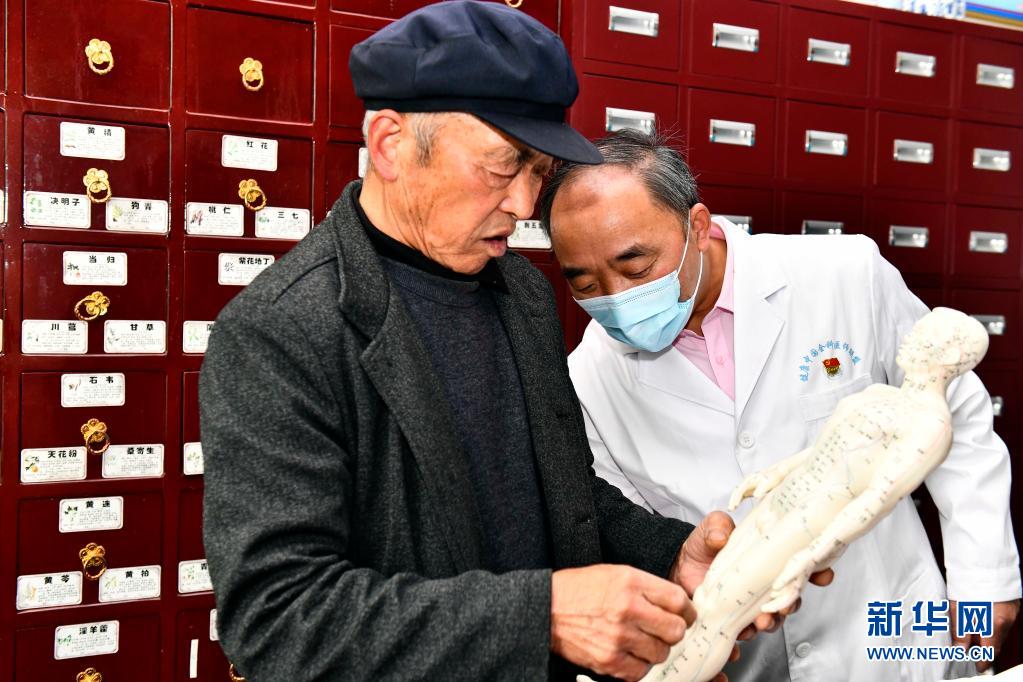 4月26日,在临沂市沂水县院东头镇院东头村卫生室,乡村医生张德庆在与父亲张在吉交流。新华社记者 郭绪雷 摄