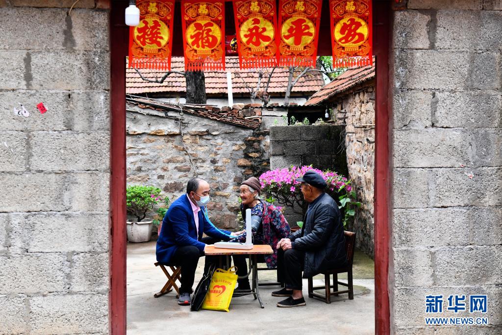 4月26日,在临沂市沂水县院东头镇曲家洞子村,乡村医生张德庆(左)上门为村民提供健康服务。新华社记者 郭绪雷 摄